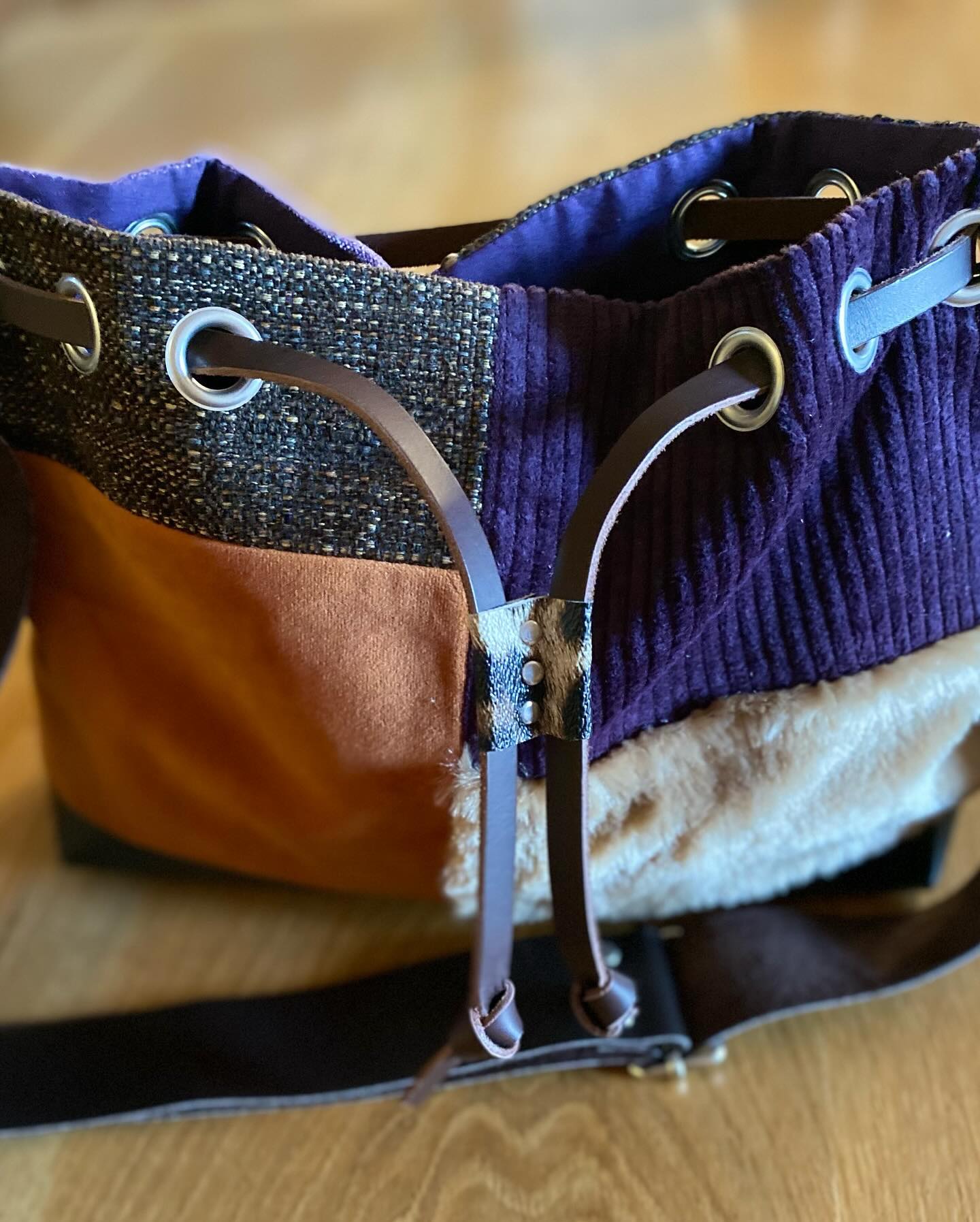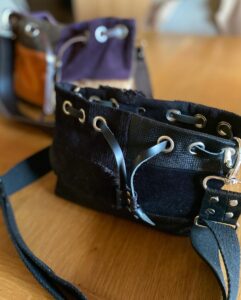 Du coup je dois bien avouer que j’ai du bosser comme une dingue sur le design de ces fameuses sangles. Déclinées en cuir ou en tissus épais , je voulais apporter une touche particulière à l’ensemble et j’ai imaginé ces empiècements rivetés qui ont immédiatement ajouté ce petit côté rock-chic, que j’affectionne particulièrement! J’avais ma sangle parfaite !